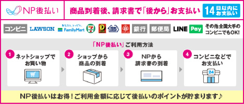 商品の到着を確認してから、「コンビニ」「郵便局」「銀行」「LINE Pay」で後払いできる安心・簡単な決済方法です。